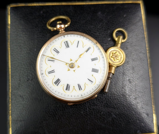 Antique 9ct gold ladies pocket watch, floral, fob watch