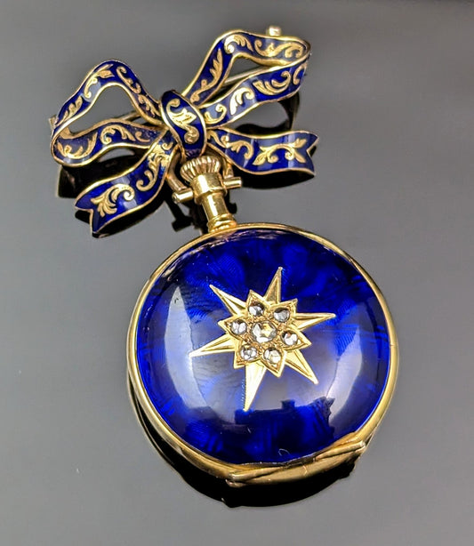 Antique Diamond star fob watch, 18ct gold, Blue enamel, Bow brooch