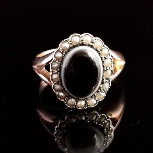 Antique mourning ring, Bullseye agate and seed pearl, 9ct gold