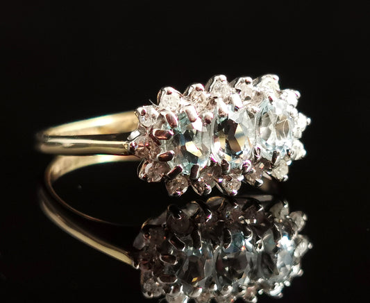 Vintage Aquamarine and diamond ring, three stone cluster, 9ct gold