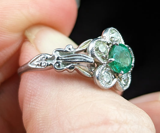 Vintage Art Deco Emerald and Diamond flower ring, platinum, Engagement ring