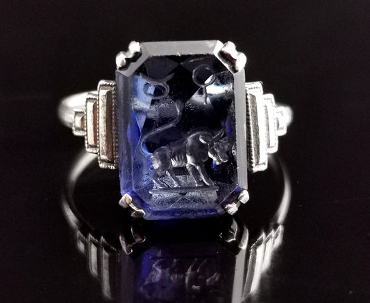 Vintage Art Deco Zodiac intaglio ring, sterling silver, Taurus