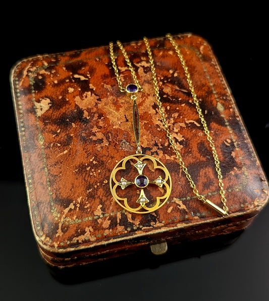 Antique Art Nouveau pendant necklace, Amethyst and Pearl, 9ct gold