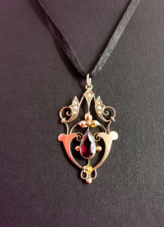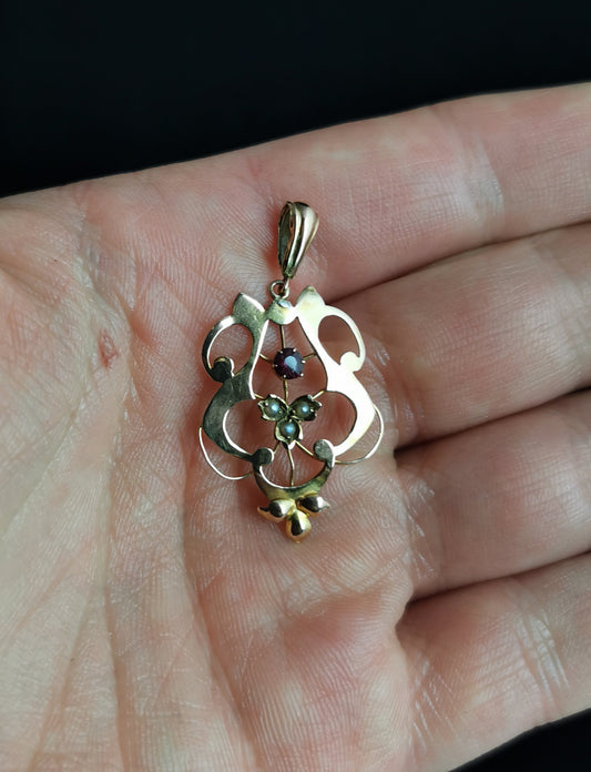 Antique Art Nouveau pendant, 9ct gold, garnet and pearl