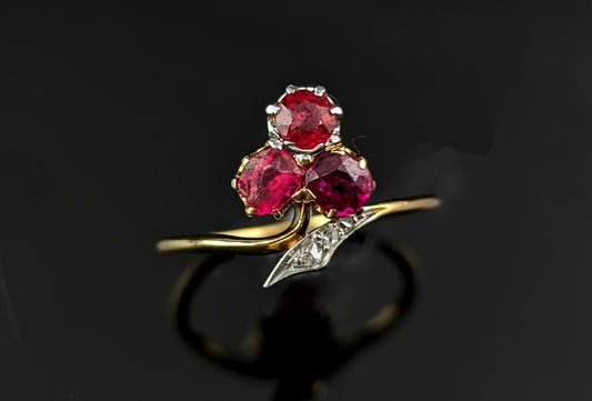 Antique At Nouveau Shamrock ring, Ruby, Diamond and Garnet doublet, 18ct gold and platinum