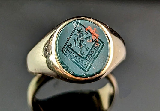 Antique Bloodstone signet ring, Lion Intaglio, 9ct gold