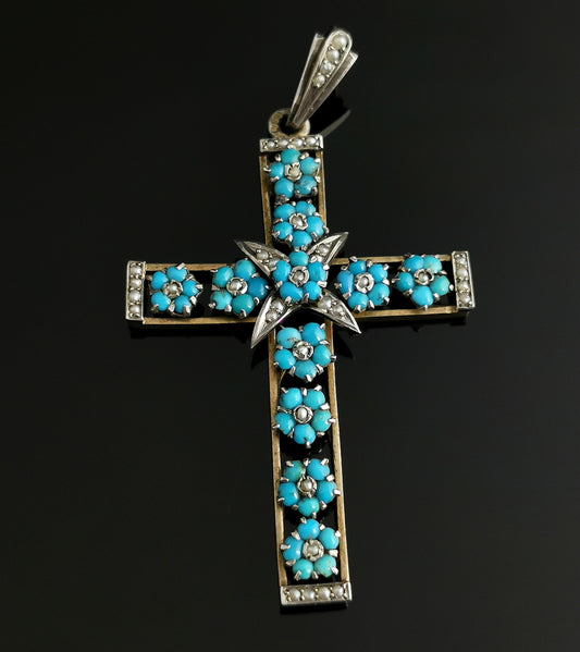 Antique Austro Hungarian Cross pendant, Turquoise, Silver and seed pearl