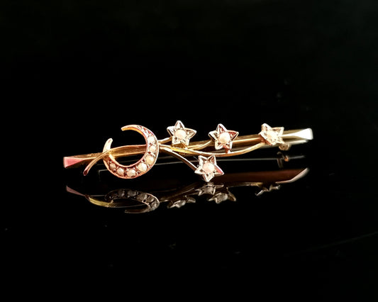 Antique 9ct gold crescent brooch, stars, seed pearl