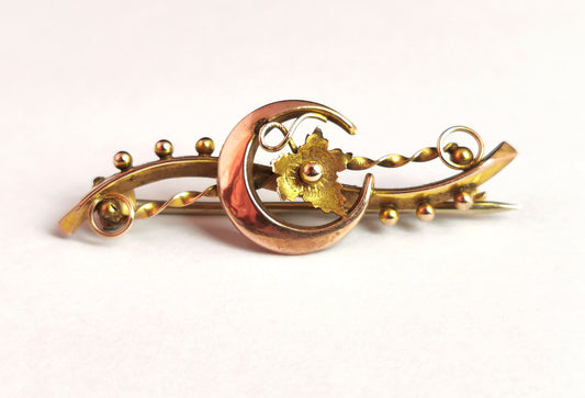 Antique 9ct gold Crescent Moon and Vine leaf brooch, Victorian