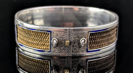 Antique Mourning bangle, Sterling silver and 9ct gold, Blue enamel and hairwork