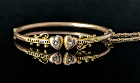 Antique 9ct rose gold double hearts bangle, Edwardian