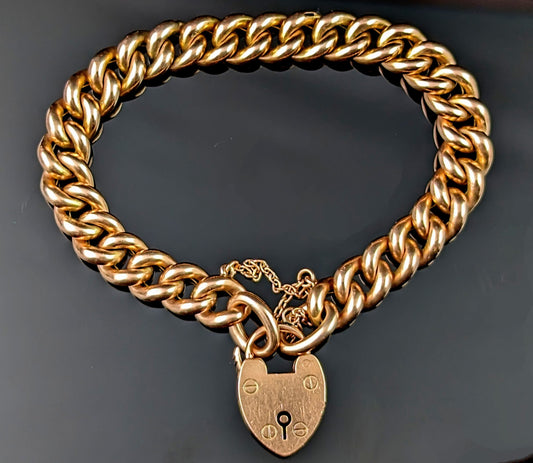 Antique Victorian 9ct gold curb link bracelet, chunky, heart padlock