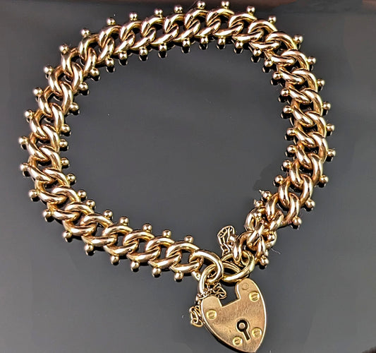 Antique 9ct gold fancy curb link bracelet, Edwardian, heart padlock
