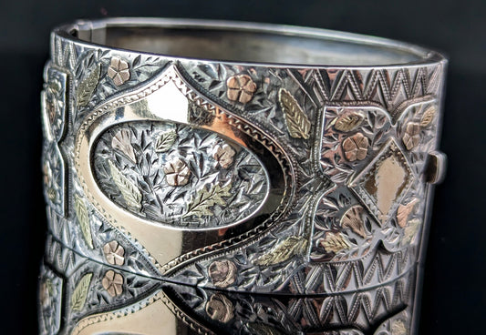 Antique Victorian silver Chunky bangle, 9ct gold Floral, Aesthetic
