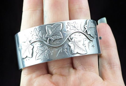 AusverkauftAntique Victorian chunky silver bangle, Ivy leaf