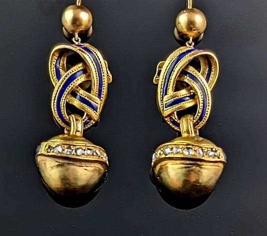 Antique Victorian Diamond lovers knot earrings, 15ct gold and Blue enamel
