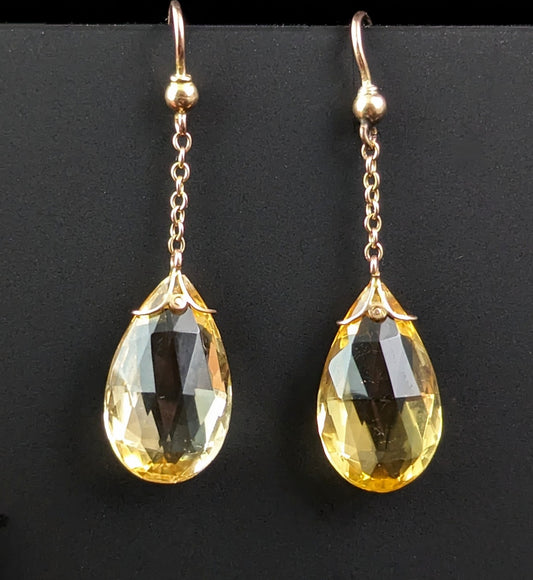 Antique Art Deco Citrine drop earrings, 9ct gold, Briolette cut