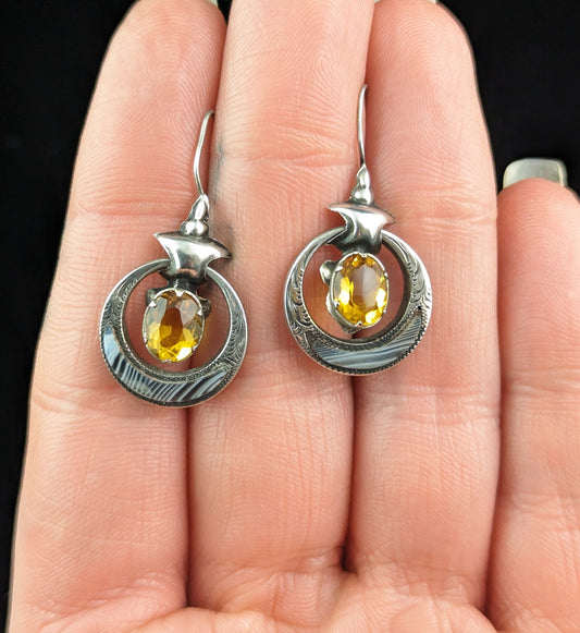Antique Victorian Scottish agate drop earrings, Sterling silver