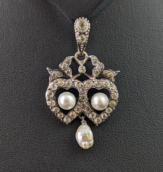Antique Silver and Paste double heart pendant, Bow, Edwardian