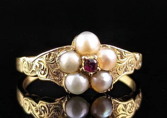 Antique Split pearl and Ruby flower ring, 18ct gold, locket back
