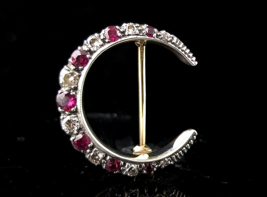 Antique Ruby and Diamond crescent brooch, silver and 9k gold
