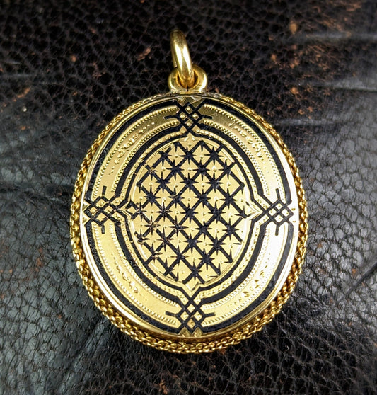 Antique Mourning locket, 18ct gold and black enamel, Victorian