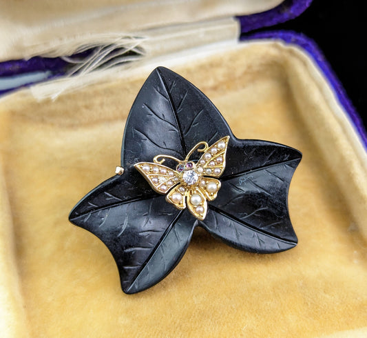 Antique Moth and Ivy leaf mourning brooch, Whitby jet, Diamond, pearl and Ruby, 15ct gold