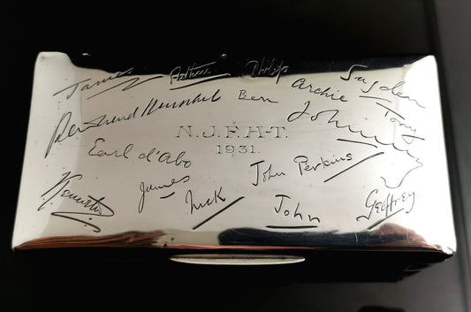 Art Deco sterling silver cigarette box, heavy, Signatures