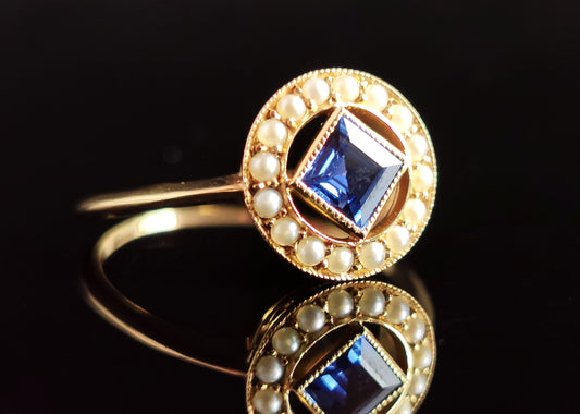 Antique Sapphire and pearl halo ring, 18ct gold, Art Deco