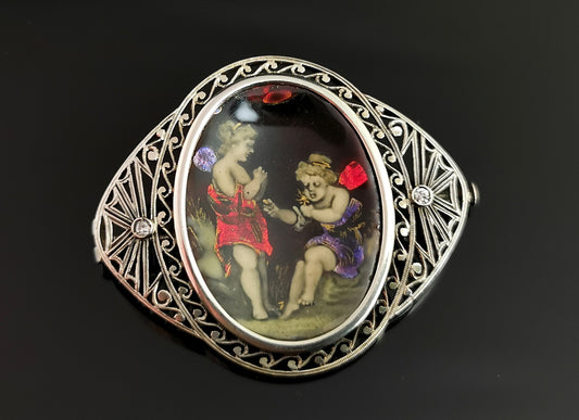 Antique enamelled fairies brooch, 18ct gold and Diamond, Art Nouveau