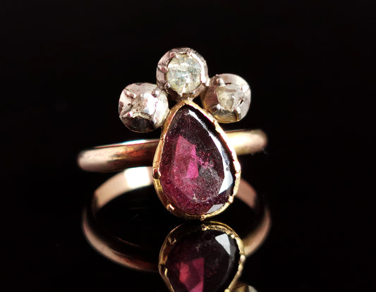 Reserved: Antique Georgian crowned heart ring, Flat cut garnet, Rose cut diamond, 9ct gold