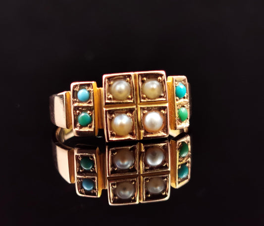 Antique Pearl and Turquoise ring, 15ct gold, Victorian