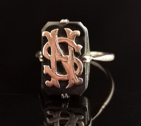 Antique Victorian mourning signet ring, 9ct gold and Onyx, initials NS