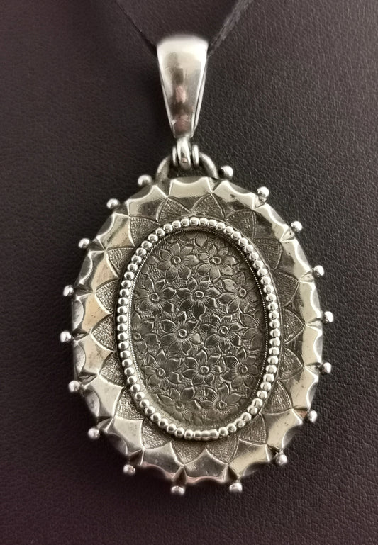 Antique Victorian silver locket pendant, Forget me not flowers