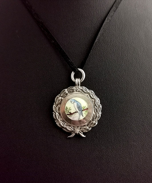 Art Deco silver and enamel watch fob pendant, Budgerigar