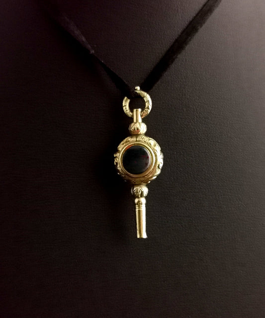 Antique Georgian 9ct gold watch key pendant, Amethyst and Bloodstone, pendant
