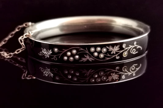 Antique Victorian mourning bangle, Silver and enamel, seed pearl