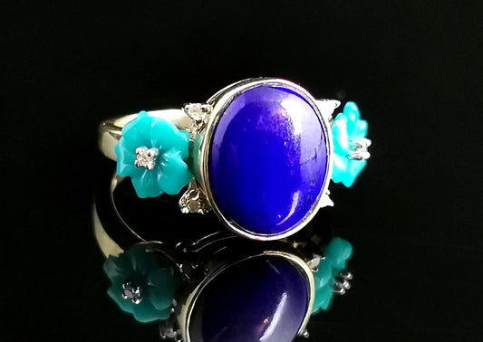 Lapis Lazuli, Diamond and Turquoise flower ring, 9ct yellow gold