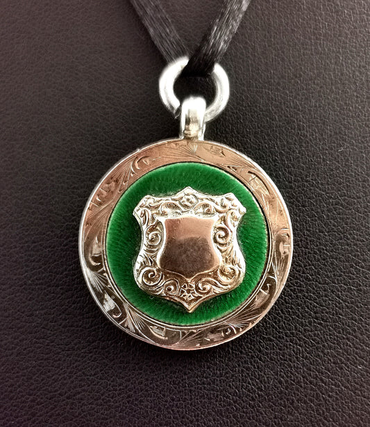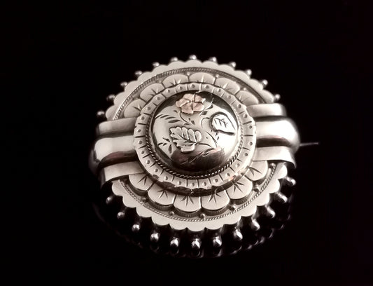 Antique Victorian Aesthetic silver locket brooch, target, floral, Rose gold