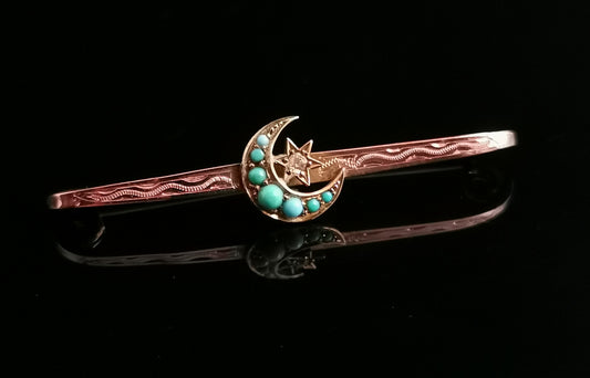 Antique Turquoise and Diamond crescent and star brooch, 9ct Rose gold