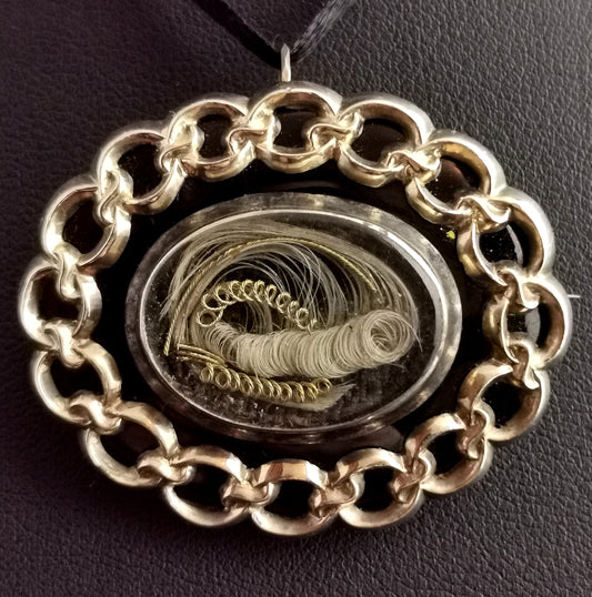 Antique Victorian mourning pendant brooch, 9ct gold, onyx and hairwork