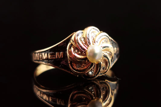 Antique Victorian mourning ring, 18ct gold, Diamond and pearl