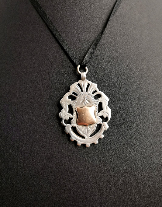 Antique Edwardian silver shield fob pendant, watch fob, 9ct Rose gold