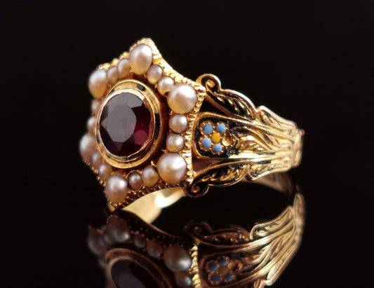 Antique Mourning ring, 18ct gold, Enamel, Pearl and Garnet, William IV