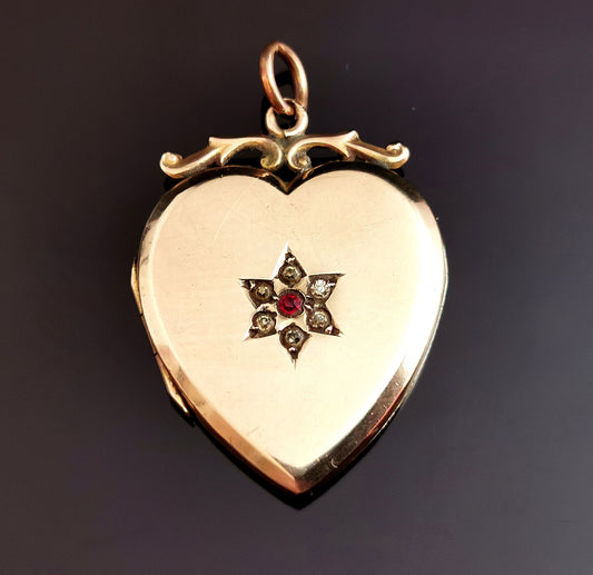 Antique heart shaped locket, 9ct gold front and back, paste star
