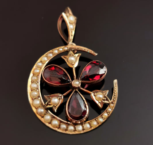 Antique Garnet and pearl Crescent and Shamrock pendant, 9ct gold