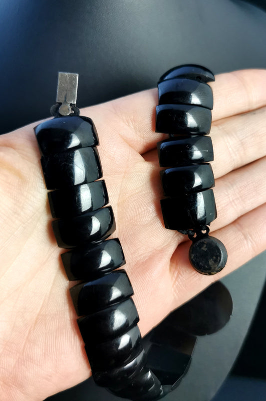 Antique Victorian Whitby Jet bangle, banded agate