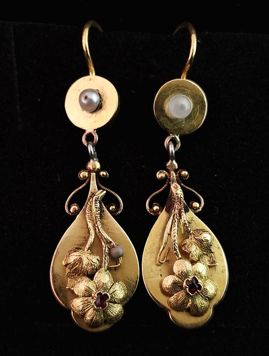 Antique Georgian 18ct gold drop earrings, Ruby, floral