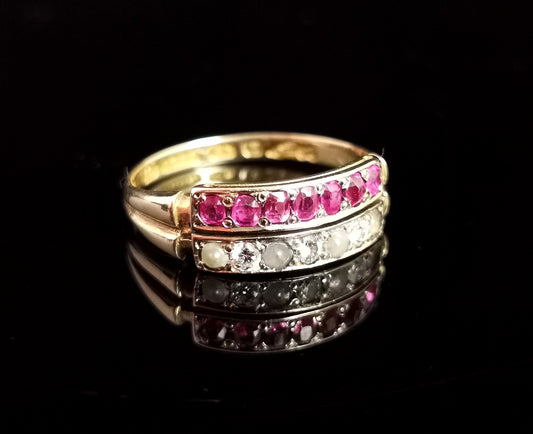 Antique Victorian Ruby, Diamond and pearl ring, 15ct gold, half hoop