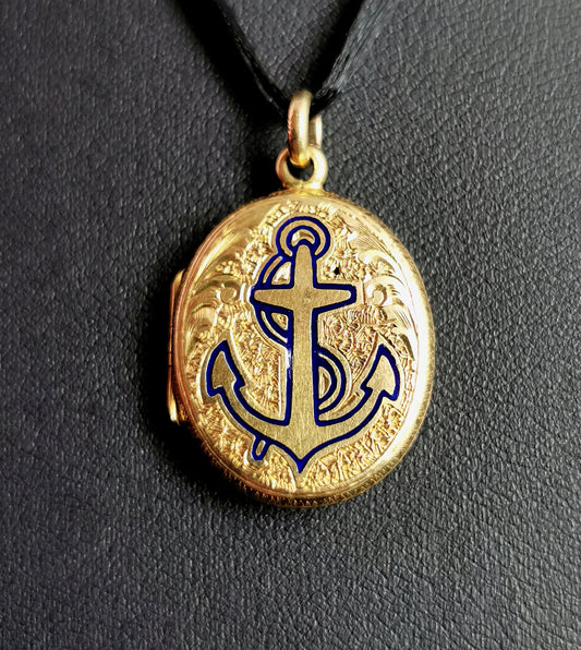 Antique Victorian 9ct gold anchor locket, blue enamel